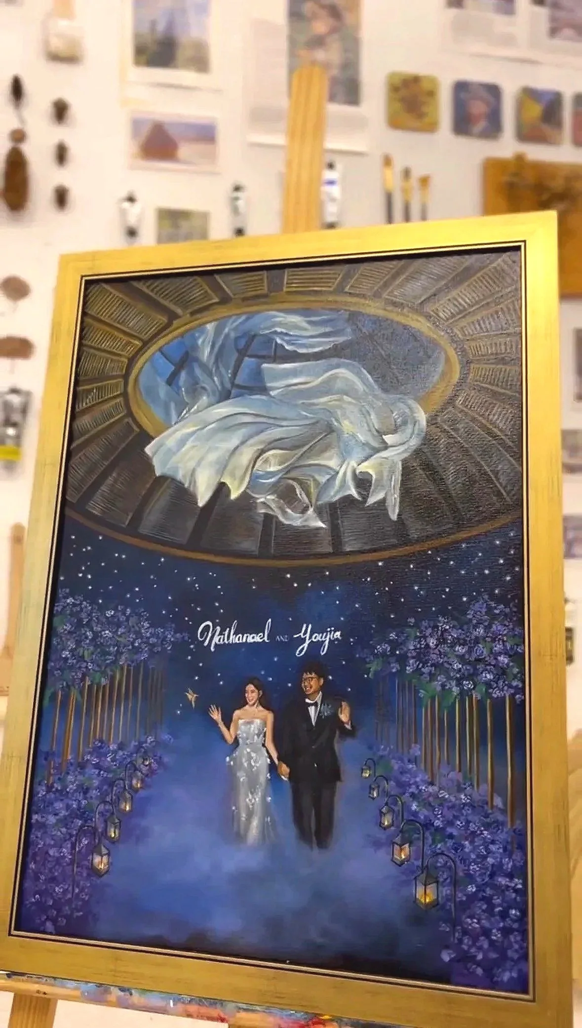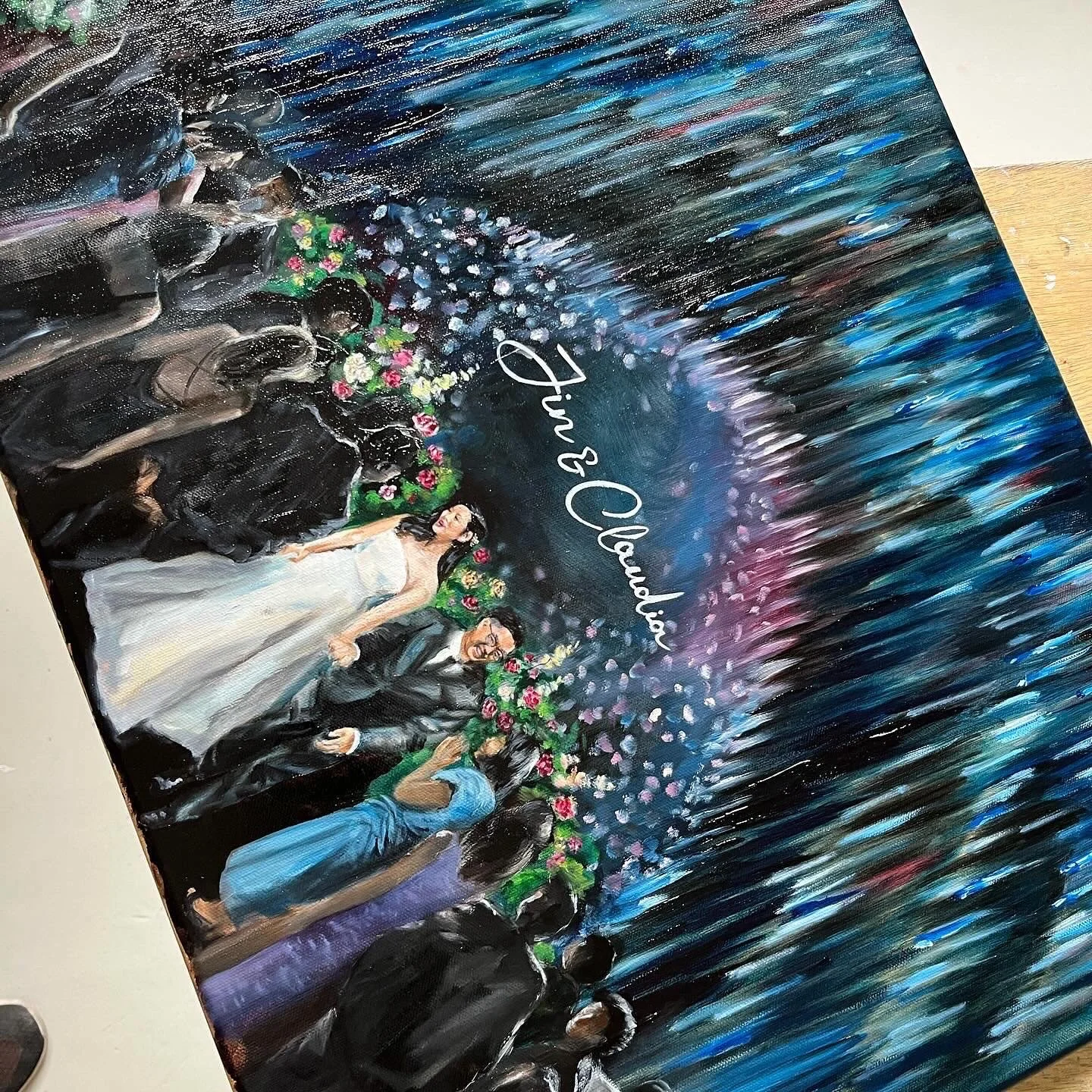 A hand painted live artwork focused solely on the two of you, capturing posture, expression, and atmosphere on site, then carefully refined in studio after the wedding.